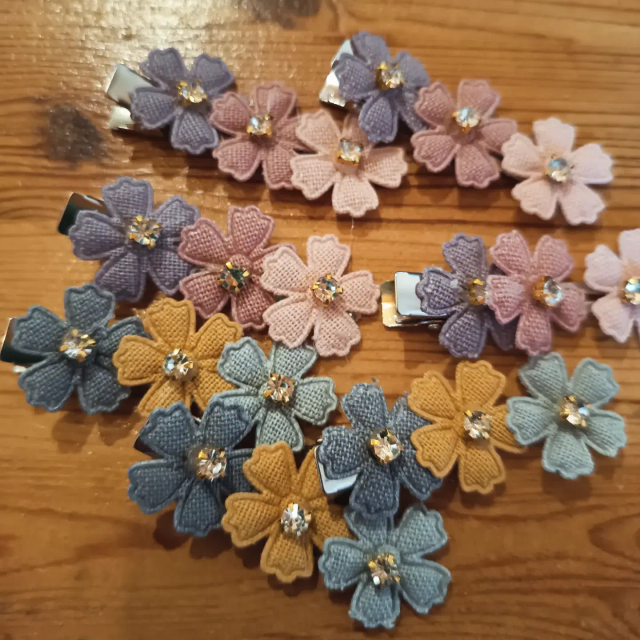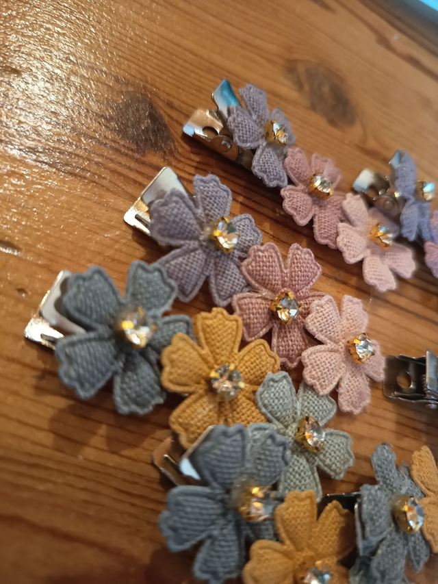 tolle Haarspangen aus weichem Leinenstoff mit Strass in verschiedenen Farben.