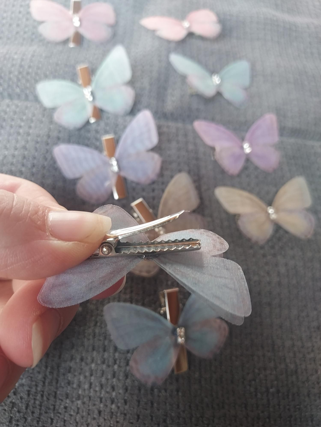 Süße Haarspangen ca. 3cm lang mit Schmetterlingen aus leichtem durchschimmernden Organza und Strass-Steinen, so haben die Schmetterlinge einen guten Stand und sind dich sehr weich. In 5 Farben erhältlich. Wahlweise in "quer" (Spange ist versteckt) oder "hochkant" (Spange bildet den Körper)